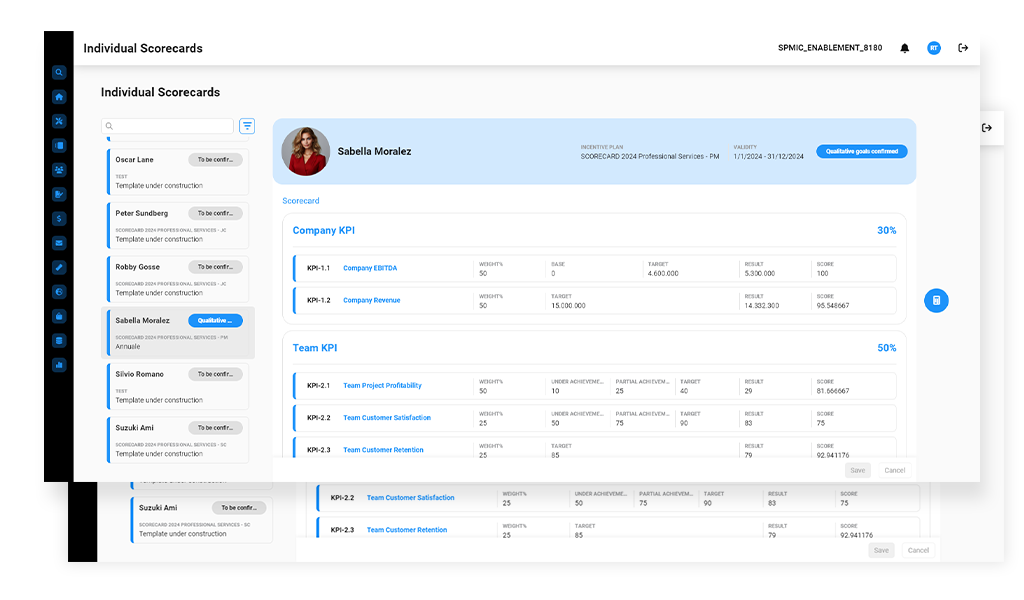 Non-sales incentive programs and compensation plans start with KPI-based measurement that blends both quantitative and qualitative factors. Using HR-defined templates, managers and payees can collaboratively customize scorecards, which are then validated and approved by managers. These scorecards may span individual, team, and company KPIs, with the flexibility to assign weighted metrics and define gates that must be achieved before rewards are unlocked.